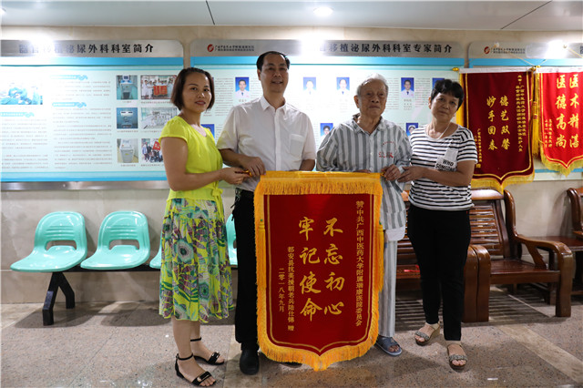 9月21日下午,瑞康医院器官移植泌尿外科病区上演了温馨的一幕,都安县九旬抗美援朝老兵陆仕锦老先生手捧两面分别写着“不忘初心、牢记使命”和“医术精湛,服务周到”字样的锦旗,分别送到医院陈锋副院长和医院器官移植泌尿外科梁泰生主任手中,再三感谢医院及泌尿外科全体医护人员对他的精心安排和周全服务,让他在治疗过程中过得非常舒心。