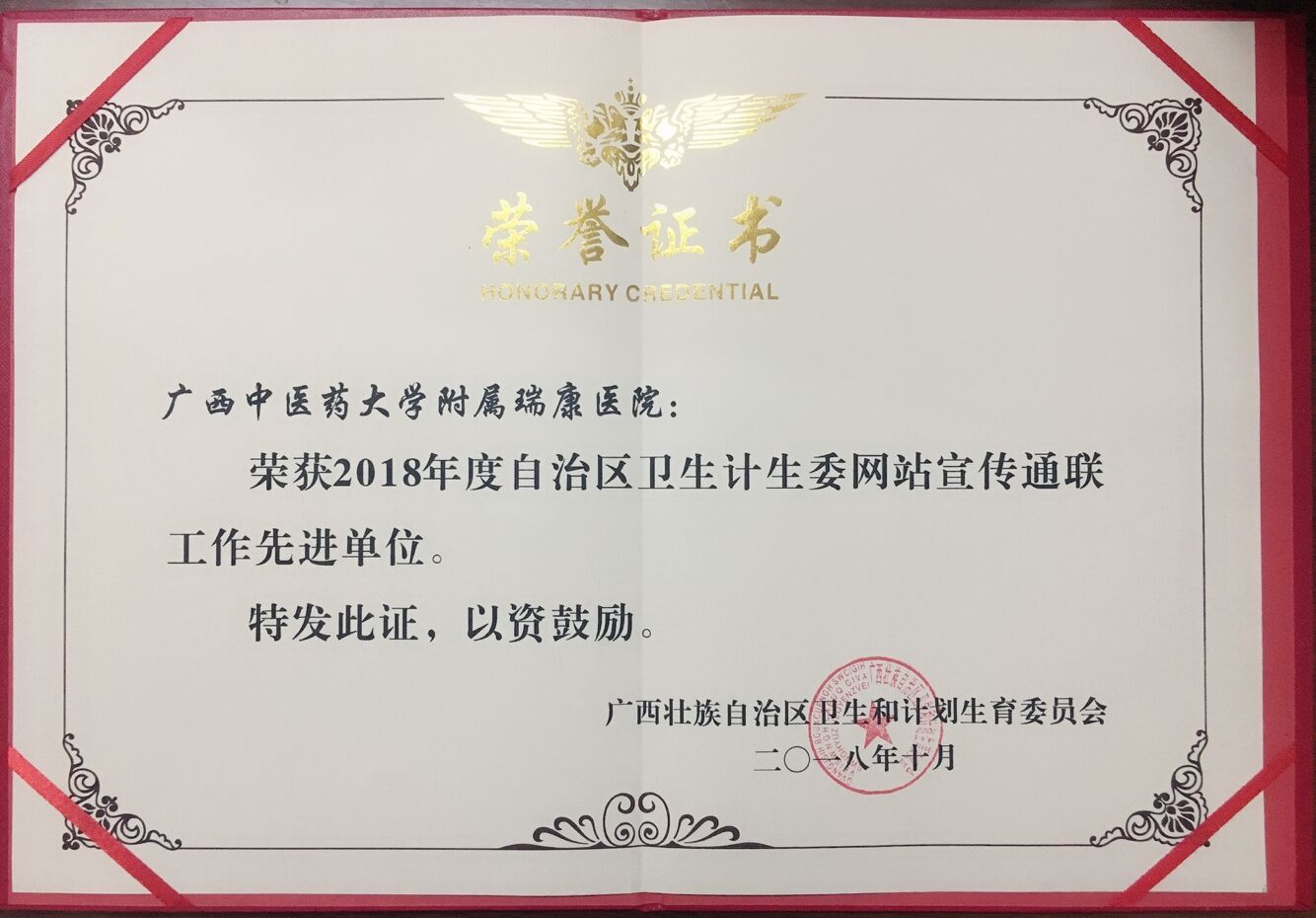 喜讯:瑞康医院荣获自治区卫生计生委网站通联工作先进单位 来源:瑞康医院 作者:宣传部 日期:2018-10-23 点击数: 次 分享到: 在刚刚下发的《自治区卫生计生委关于表扬2018年度自治区卫生计生委网站宣传通联工作先进单位和先进个人的通报》文件中,瑞康医院荣获2018年度自治区卫生计生委网站宣传通联工作先进单位。 打印正文 关闭本页