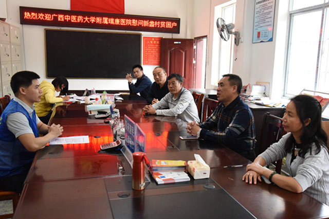 抵达隆安后,唐友明在新盏村村委会办公室听取了医院派驻第一书记李金荣的工作汇报,详细询问当地脱贫工作的进度以及当前面临的工作重点和难点。李金荣表示,今年五月,新盏村已顺利通过核验,达到了脱贫摘帽的标准,目前的工作重点是支持乡村持续发展,脱贫不返贫。同时,新盏村的党建、教育等方面都在有条不紊地推进,实现了适龄儿童都有学上,定期组织党员会议,及时学习新政策、新知识。唐友明在听完汇报后嘱咐道,一定要因地制宜地开展工作,确保扶贫政策精准落地,尽职尽责地完成各项工作任务,碰到困难及时向医院反馈,将全力帮助新盏村打好脱贫攻坚战。