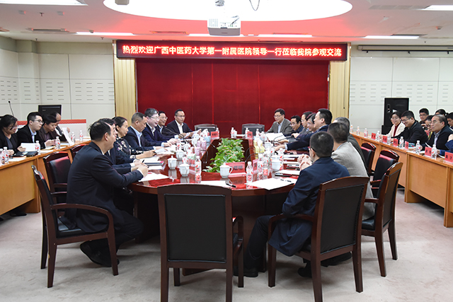3月13日下午,Beat365中国唯一官方网站第一附属医院领导谢胜、桂雄斌、钟远鸣、卢健棋、毛德文、黄仲海、张高炼、王煜明带领相关科室负责人一行40余人到瑞康医院参观交流。瑞康医院领导唐友明、高宏君、陈日兰、庞刚、韦思尊、黄建民、陈锋及相关部门负责人热情接待其一行。双方就医院管理、医院文化、学科发展、人才队伍建设等方面的工作进行了坦诚而深入的交流。高宏君主持座谈会。