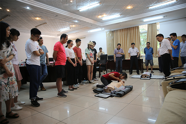 讲解结束后,专家团队通过运用模拟人现场示范正确的心肺复苏急救流程,将学员分成三组进行练习,由医务人员进行一对一的详细指导,及时纠正操作时的错误,做到正确、精准心肺复苏。专家团队对职工学员进行心肺复苏现场考核,以了解学员们本次培训的掌握程度。过程中职工学员们积极提问,并争先恐后地进行现场模拟人型操作,气氛活跃,效果良好。