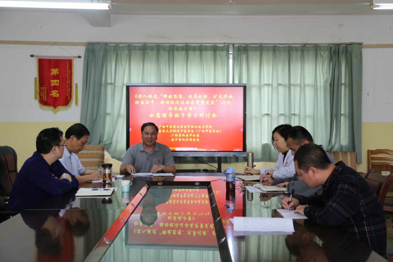 为深入学习贯彻鹿心社书记在全区省级领导和厅级主要负责同志专题研讨班的讲话及专题报告重要指示精神。5月8日,重阳老年公寓集中组织学习了“解放思想、改革创新、扩大开放、担当实干,奋力开启建设壮美广西共圆复兴梦想新征程”的讲话精神。会上,重阳老年公寓院长黄颖首先向院领导班子的各位成员传达了文件要求,黄颖指出,重阳老年公寓各分管领导要统一思想,充分认识问题和差距,切实解放思想,正视差距和不足,进一步解放思想,强化措施,着力补齐工作短板,通过解决一些发展问题,破除发展瓶颈。