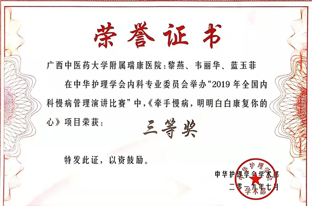 7月20日,由中华护理学会举办的全国内科慢病管理演讲比赛在贵阳举行。附属瑞康医院心血管内科一区及心脏康复中心护理团队的《牵手慢病,明明白白康复你的心》被广西护理学会选送参加此次大赛,经过激烈角逐,最终荣获三等奖。
