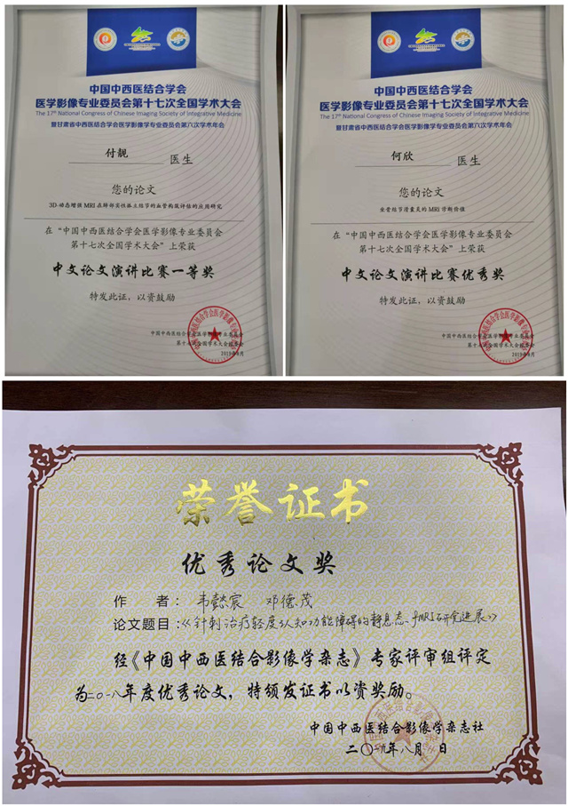8月22日至25日,中国中西医结合学会医学影像专业委员会第十七次全国学术大会(CISIM2019)在兰州召开。经专家评审,15名各省大学附属医院的医生参加了“中文论文演讲比赛”,经过激烈角逐,一附院放射科付靓医生荣获第一名,何欣医生荣获优秀奖。大会协办单位《中国中西医结合影像学杂志》杂志社评选2018年度优秀论文,我院放射科韦懿宸医生荣获优秀论文奖(5名获奖者之一)。