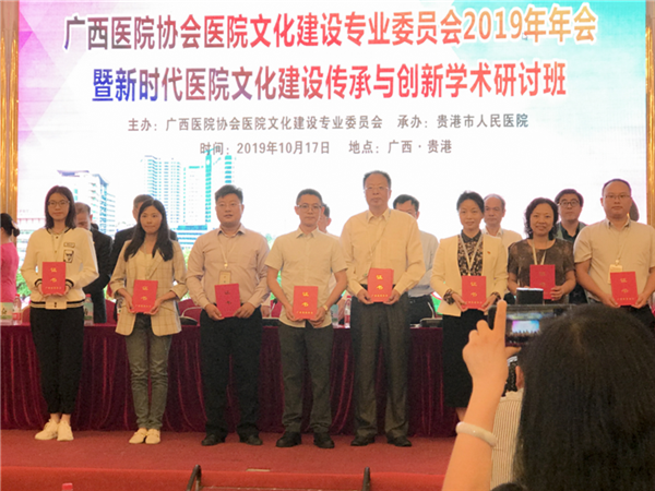 会议上,主办方对2019年年会优秀论文、优秀微电影和组织奖进行了表彰。来自广西全区各医院的230篇征文和61部微电影经过评审专家严格的筛选,最终,一附院选送的《公立医院"社工 志愿者 医务人员"三位一体医务社工模式与新时代人文医院建设实践研究》《新时代医院文化建设对医院品牌塑造的实践与思考》2篇论文获得二等奖,《新时代新形势下医院党建与文化建设》等7篇论文获得三等奖和优秀奖,微电影《精诚以待》获得提名奖,因一附院上报的论文质量、数量均比较突出,获组委会授予优秀论文组织奖。一附院在文化建设方面的研究成果再次得到全区专家的肯定。年会上与会专家紧紧围绕新时代医院党建工作和医院文化建设的新思路、新机制和新方法进行了深入探讨研究。