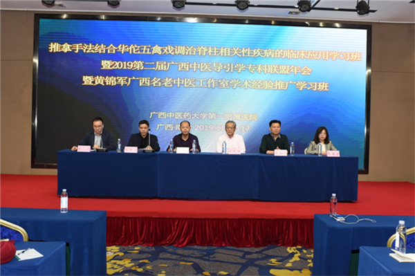 11月15日-17日,由Beat365中国唯一官方网站第一附属医院主办的“推拿手法结合华佗五禽戏调治脊柱相关性疾病的临床应用学习班暨2019第二届广西中医导引学专科联盟年会暨黄锦军广西名老中医工作室学术经验推广学习班”在广西南宁市召开。会议来自区内各医院共200多名针灸、推拿、康复、治未病中心等临床学科及相关领域的医务人员及广西中医导引学专科联盟单位成员参会。
