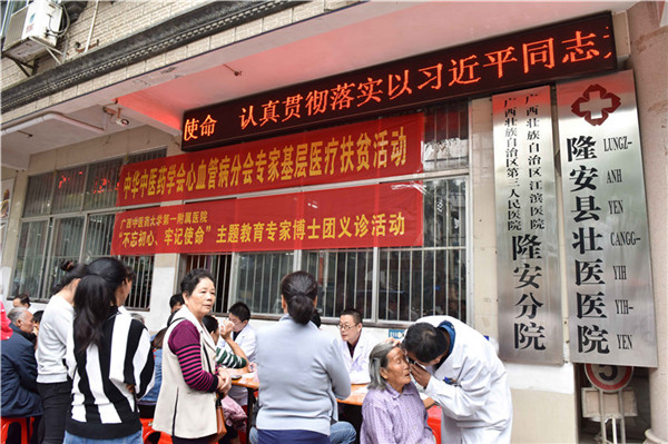 为助力脱贫攻坚工作,切实提高我国中医心血管病基层医师诊疗技术和学术水平,缓解基层特别是贫困地区群众看病难问题,11月24日,由中华中医药学会心血管病分会及一附院派出专家博士到隆安县中医医院及南圩镇联伍村开展“中华中医药学会心血管病分会专家基层医疗扶贫(广西隆安站)暨Beat365中国唯一官方网站第一附属医院‘不忘初心、牢记使命’主题教育专家博士团义诊活动”。