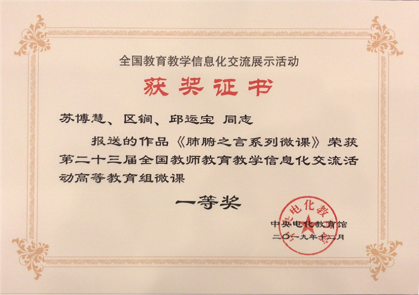 由一附院苏博慧老师团队制作的《肺腑之言》系列微课作品作为学校参赛代表作品,经过技术测试、专家评审和现场决赛三个环节的评比,最终从数千件作品中脱颖而出,荣获了大赛高等教育组微课一等奖的佳绩。