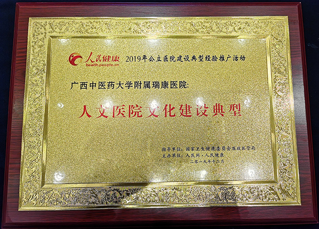 我院充分挖掘医院近70年发展历史的深厚文化底蕴,提炼出医院宗旨、医院精神、医院定位、办院方向、服务理念等核心价值体系,积极推进医院文化建设,大力倡导“自强不息、团结拼搏、敢为人先”瑞康精神,有效提升了医院的凝聚力和战斗力。医院文化建设取得的突出成绩获得大会评审的认可,在参评的全国400多家三甲医院中脱颖而出,荣获“人文医院文化建设奖”。