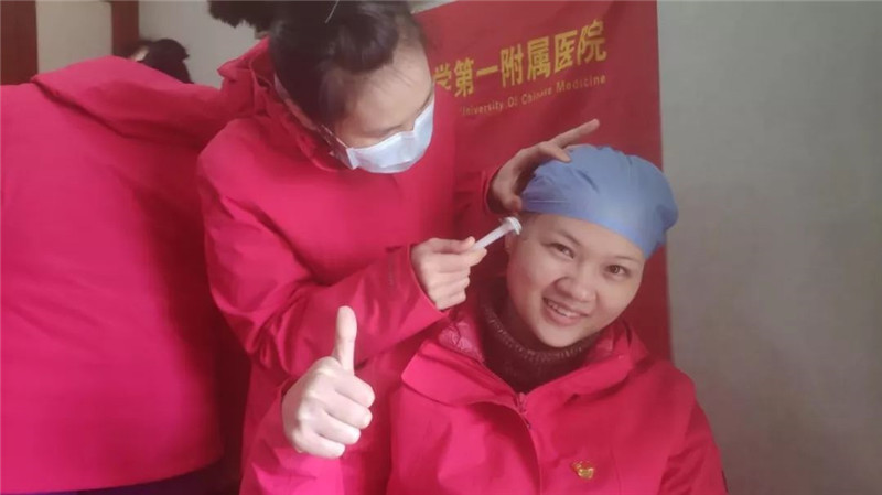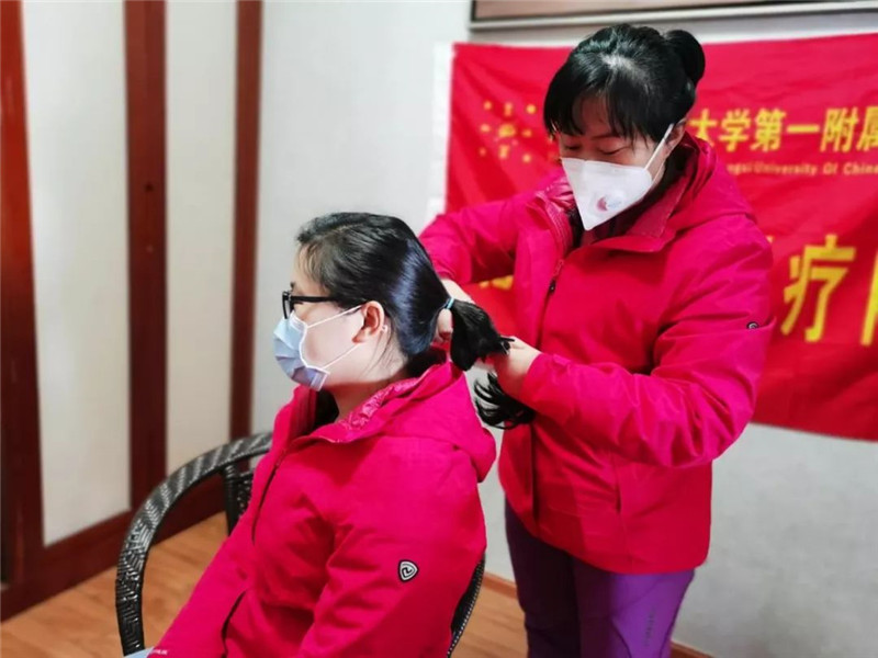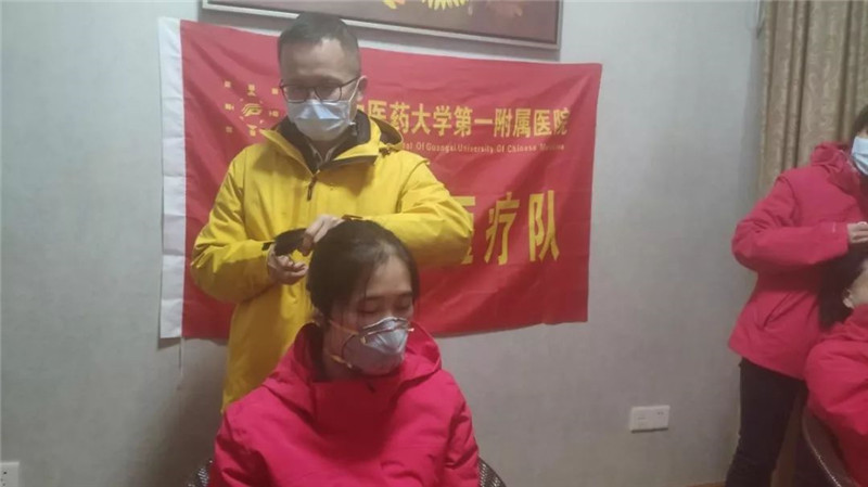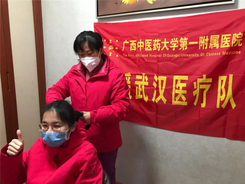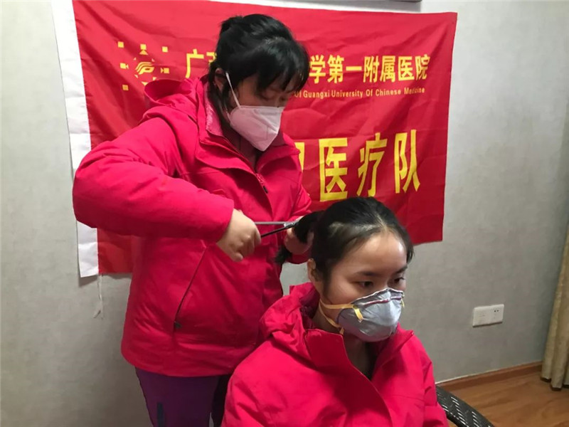 队员梁道业、高斯莉、韦艳春等充当临时理发师,听着剪刀咔嚓咔嚓的声音传入耳边,看着一头长发纷纷落下,纵有不舍,为了方便救治工作开展,姑娘们平静而坚定!