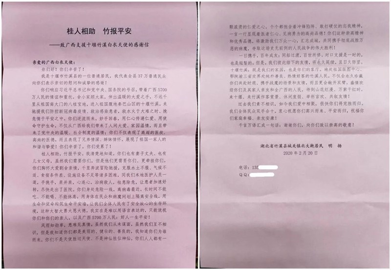 “亲爱的广西白衣天使:你们好!你们辛苦了!我是十堰竹溪县的一位普通居民,我代表全县37万普通民众向你们表示亲切的慰问和诚挚的感谢!你们响应习近平总书记和党中央、国务院的号召,带着广西5700万人民的情谊和重托,舍小家顾大家,伸出温暖的大手,不远千里从祖国南大门的八桂宝地,进入祖国腹地秦巴山区的十堰竹溪,来驰援我们防控新冠病毒疫情、救治感染患者,救水火于大难之时、挽危情于平安之中......”2月20日,一封情真意切的感谢信送到了我院赴十堰医疗队队长陈平的手中。我院医疗队于2月12日赶赴十堰支援当地医疗工作,进驻以来,他们以精湛的医疗技术,体贴入微的护理关怀,温暖着寒冬中的竹溪,守护着37万名竹溪人民。