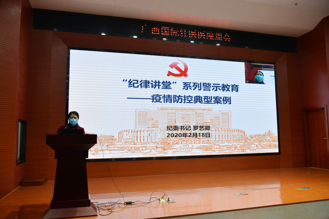 2月18日下午,广西国际壮医医院举行“纪律讲堂”第九讲警示教育活动,医院纪委书记罗艺徽结合自治区新型冠状病毒感染的肺炎疫情防控工作领导小组指挥部对全区各级党组织、广大党员干部和公职人员提出的“八个坚持 八个严禁”要求,通报了疫情期间作风不实、履职不力、瞒报谎报等“六种行为”典型问题案例,要求全院职工要提高政治站位,增强疫情防控工作责任感;严明纪律规矩,确保疫情防控工作部署到位。