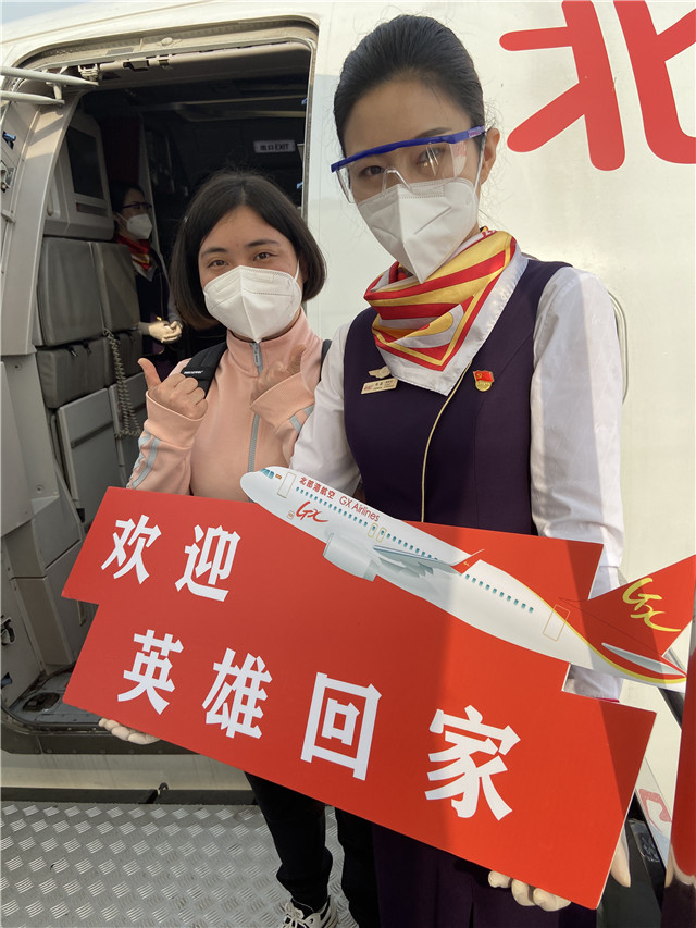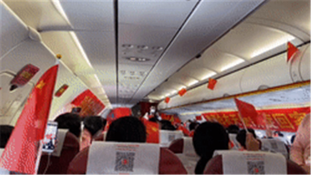 “五星红旗迎风飘扬,胜利歌声多么响亮……”飞机上,广西医疗队员们唱起赞歌。