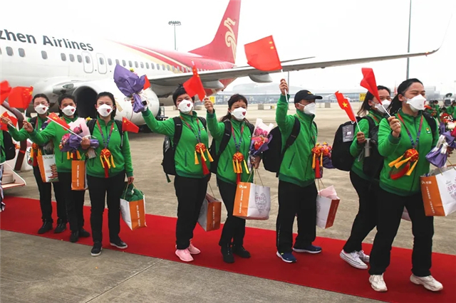 3月29日15时40分,在大家的期待中,搭载着广西第四批援助湖北省抗疫医疗队的“胜利号”顺利落地!当机舱门开启,队员们带着胜利的笑容,依次走下飞机舷梯,等待多时的工作人员为他们献上鲜花,同声高喊:“欢迎英雄回家!”