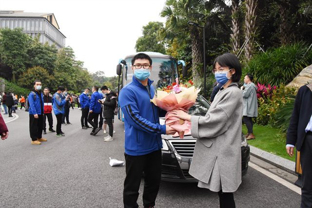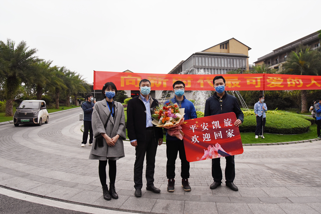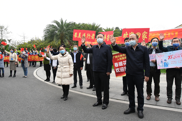 4月1日,经过14天规范隔离,广西支援湖北医疗队首批返回人员解除医学隔离观察,附属瑞康医院参加赴湖北抗击疫情的医务人员沈飞平安“回家”。自治区人民政府副主席黄俊华在自治区卫健委主任廖品琥及自治区新冠肺炎疫情防控指挥部有关同志的陪同下为他们举行了简短的欢迎仪式,附属瑞康医院副院长韦思尊带领医务部等部门同事迎接沈飞。
