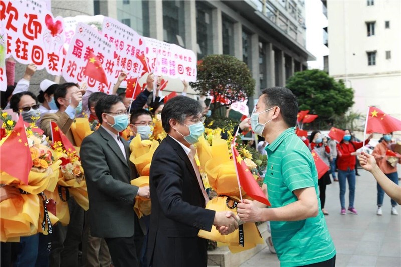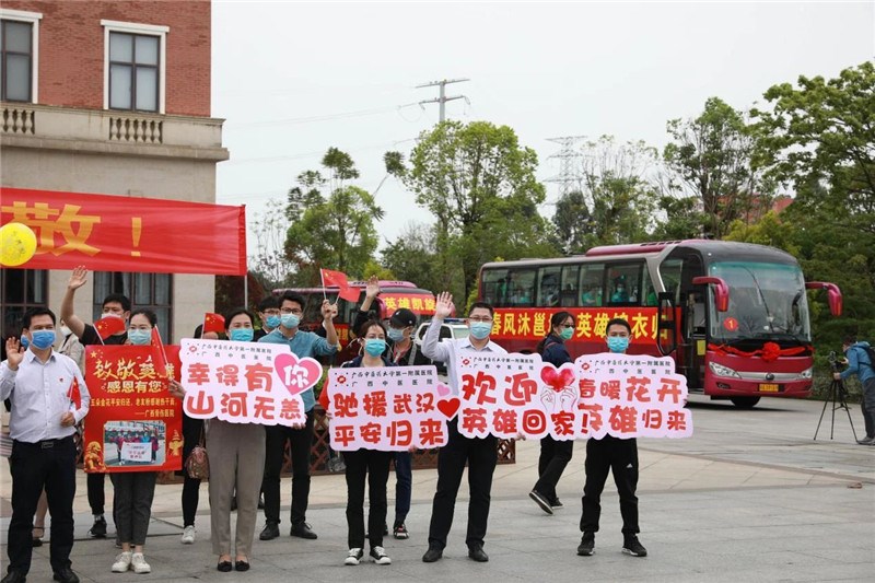 桂雄斌在迎接时激动地对队员们说:“今天是大家结束休整,胜利回家的日子。广中医为你们感到骄傲,欢迎大家平安回家!”