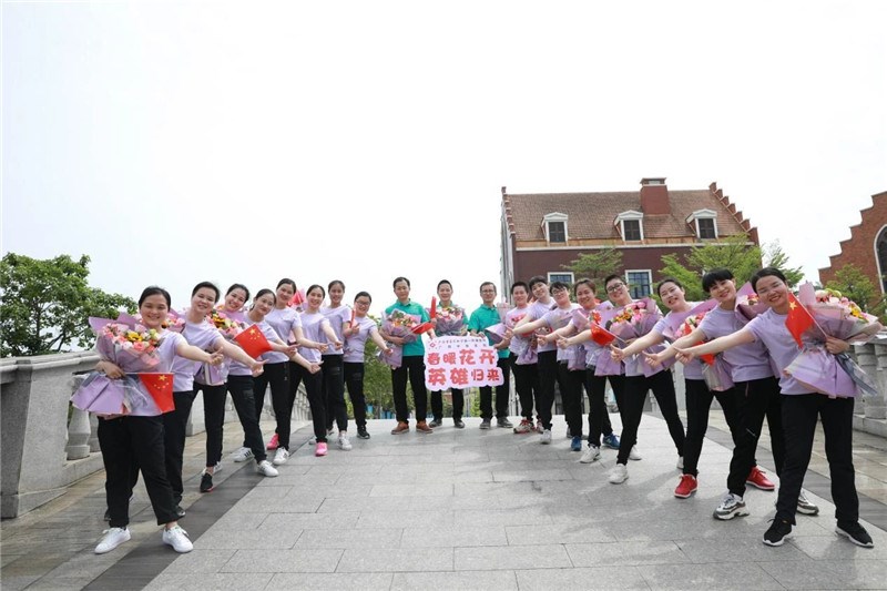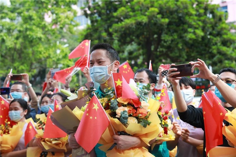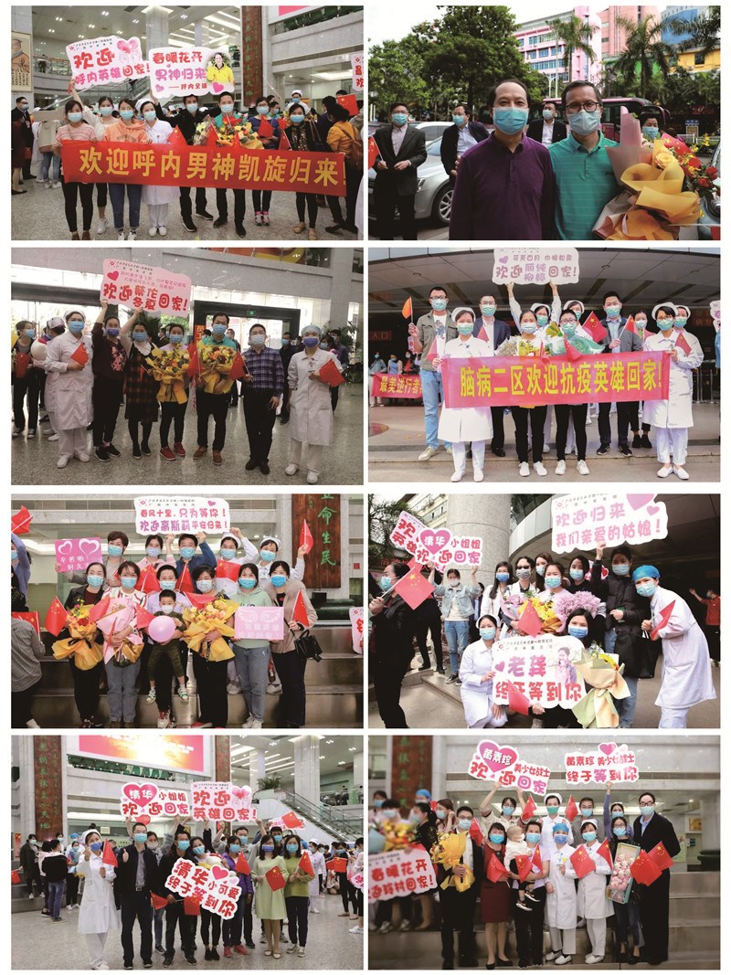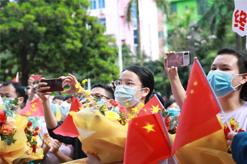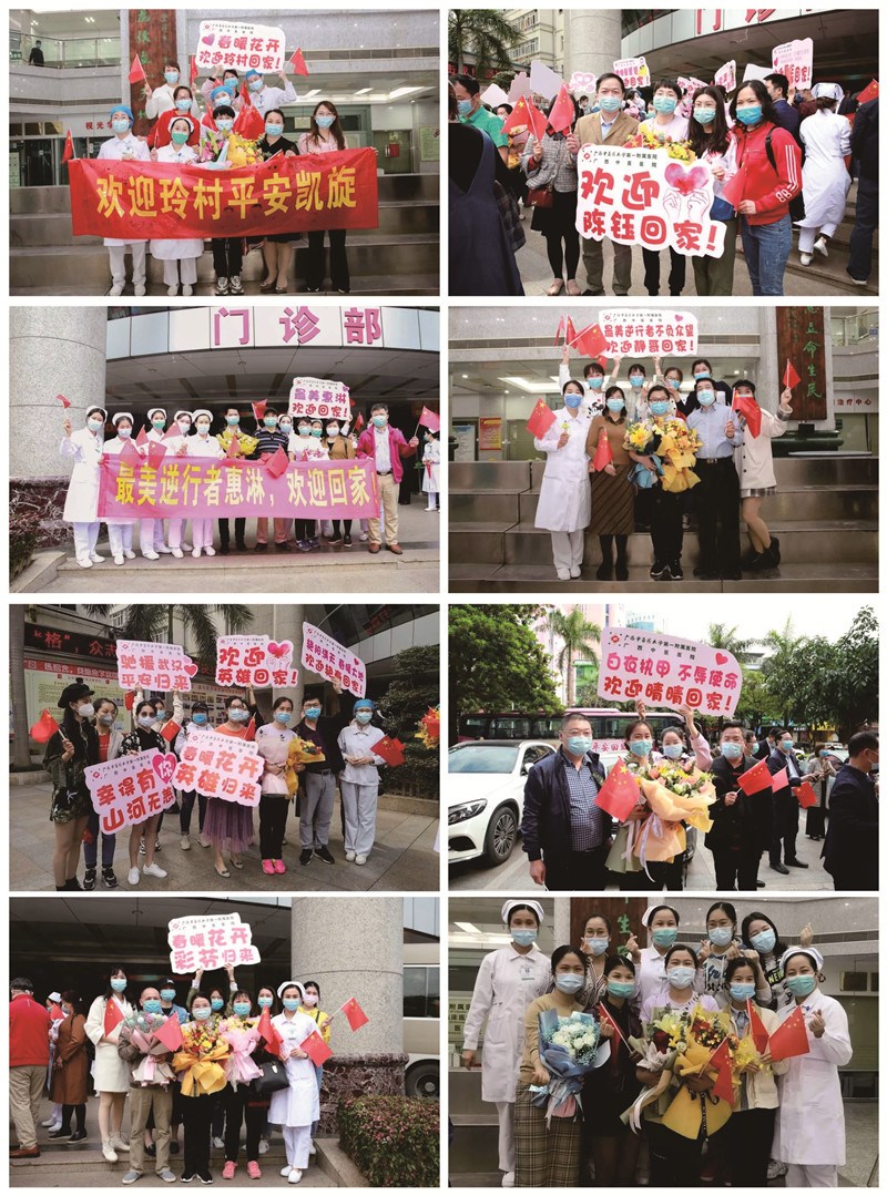 一句句温暖的问候,一束束鲜艳的捧花,队员们脸上洋溢着幸福的笑容,开心的欢呼:“广中医,我们回来啦!”