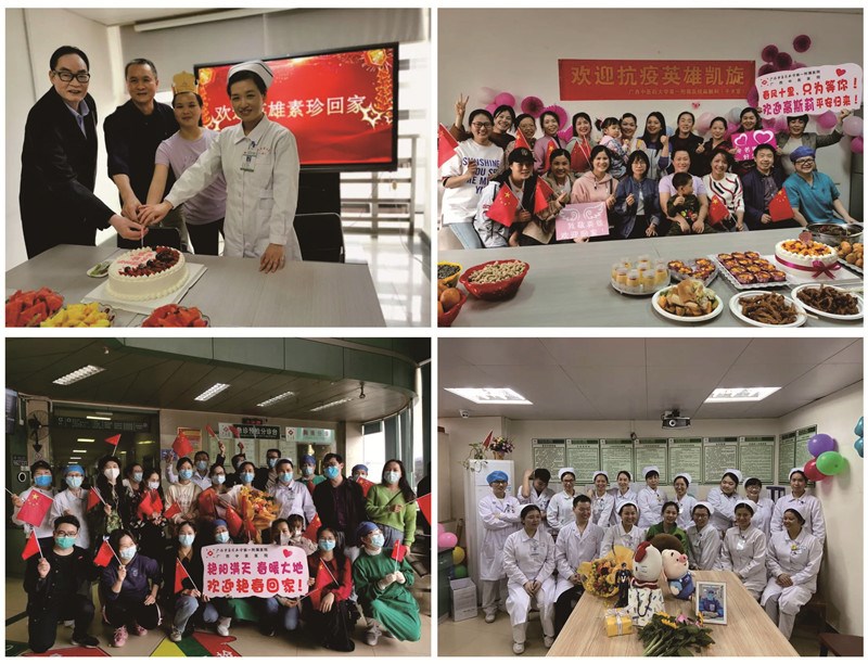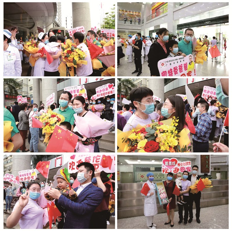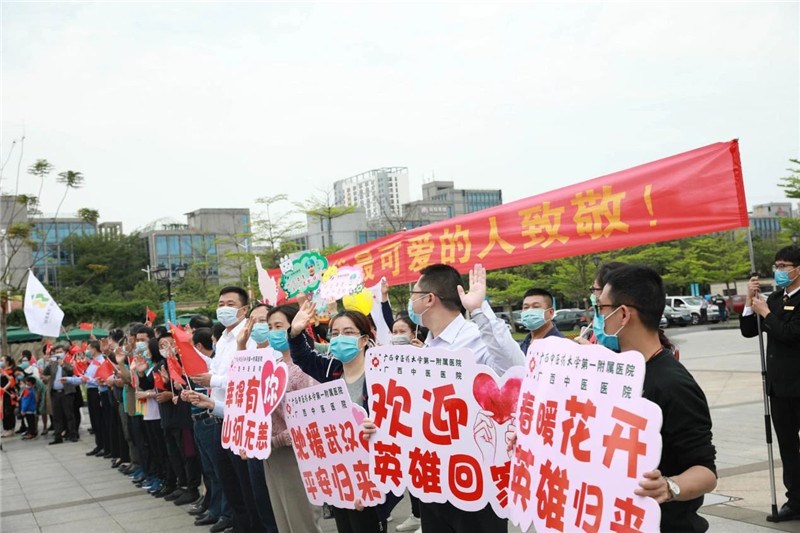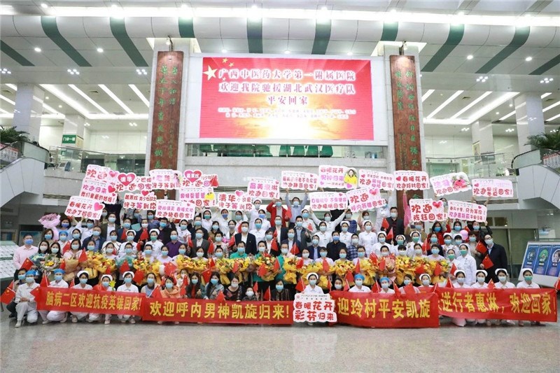 在这场新冠肺炎疫情阻击战中,一附院驰援湖北武汉医疗队19名队员守护沌口方舱医院,转战协和重症病房,所在的广西第四批驰援湖北医疗队也成为广西唯一一支两地“战斗”的队伍。至此,一附院26名驰援湖北医疗队队员已全部平安归来与家人团聚。在忘我奋战的日日夜夜,一附院医疗队全体队员同时间赛跑、与病魔较量,不辱使命、不负重托,出色地完成了各项支援任务,用实际行动诠释了大爱无疆、医者仁心的崇高精神。