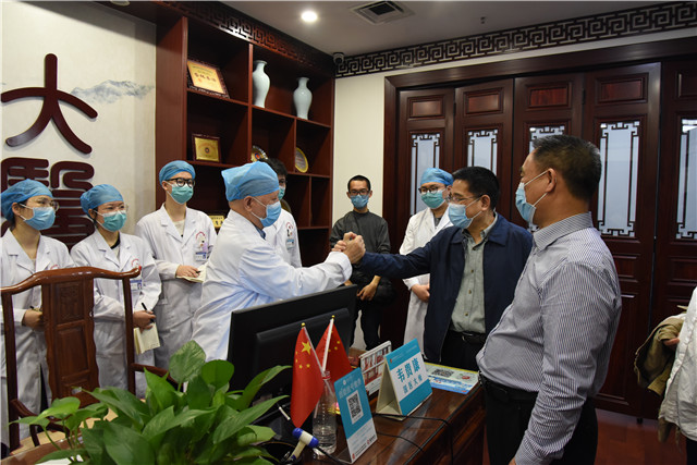 吴才林先后参观了医院国医大师馆、国医堂、院史馆、治未病中心、肿瘤科、胸心血管外科、康复医学科、中西医结合转化中心等,并深入科室与医护人员进行交流。参观结束后,吴才林一行到医院A座27楼中西医结合转化医学中心进行座谈交流。
