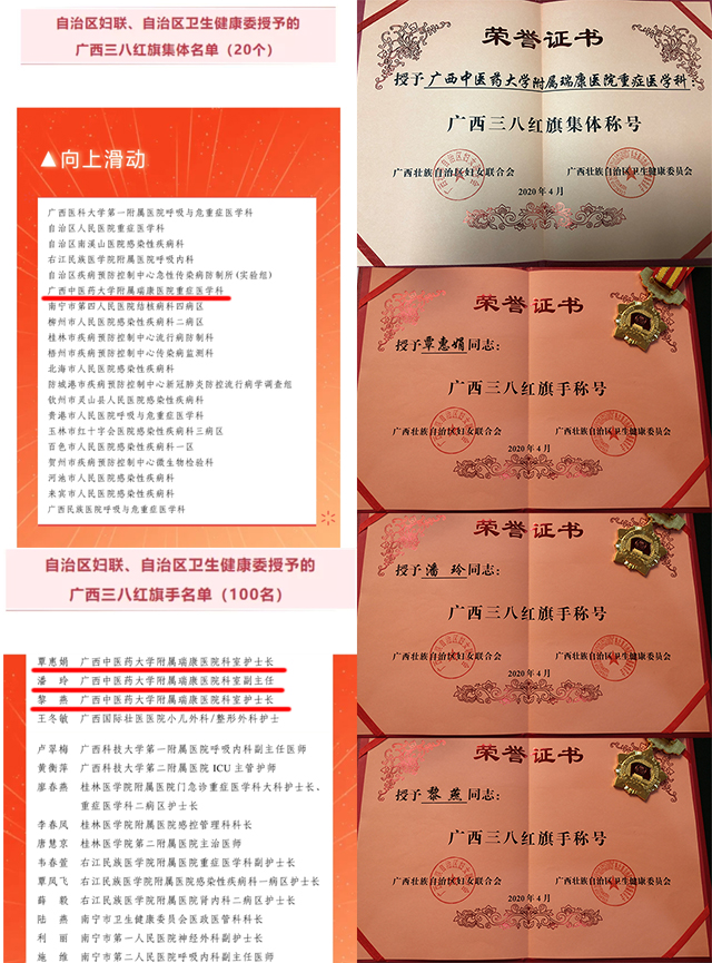 喜讯:附属瑞康医院重症医学科及三名驰援湖北医疗队队员获广西三八红旗集体和广西三八红旗手表彰