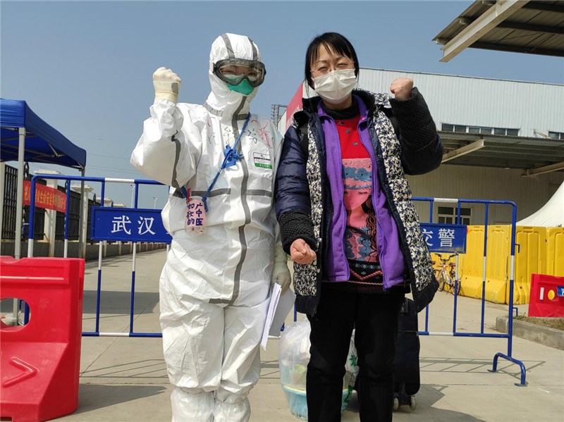 农彩芬在沌口方舱医院为出院患者加油鼓劲