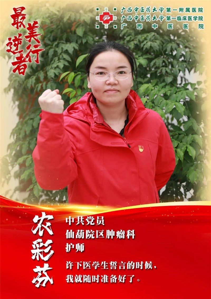 农彩芬,中共党员,广西援湖北抗疫医疗队员,Beat365中国唯一官方网站第一附属医院仙葫院区肿瘤科护师,党支部宣传委员,团支部书记。曾获医院感染管理先进个人、年度“最美护士”、广西首届医院感染预防与控制青年演讲比赛特等奖、中华护理学会举办的中医科普比赛二等奖、广西三八红旗手等荣誉。2020年3月所在广西方舱护理团队荣获全国卫生健康系统新冠肺炎疫情防控工作先进集体。