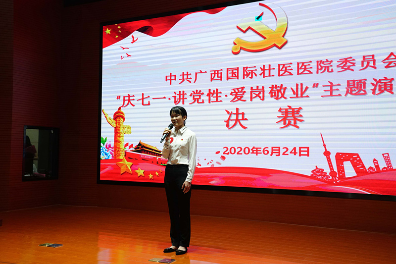 在中国共产党建党99周年来临之际,6月24日晚,附属国际壮医医院举行了“庆七一·讲党性·爱岗敬业”主题演讲比赛决赛。来自医院各基层党支部的14位选手,抒发爱国爱党爱院情,表达爱岗敬业志,向党的生日献礼。