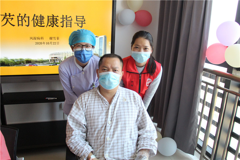 活动开始,社工向患者们简要介绍了本次活动的主题、内容、活动流程等。随后由风湿病科的谢护士给患者们进行《风湿病相关健康知识》宣教讲座,患者们都听得十分认真,有的还用笔认真地把知识要点记在健康知识小册子上面。时间飞快流逝,当健康宣教讲座分享完后,患者们积极分享自己的风湿病治疗体会,患者黄大爷说道:“原来我的风湿导致我的腿一直很痛,都不能走路,现在住院调理后,腿关节没那么痛了,自己都慢慢能下地走路了。真的很感谢医生和护士对我的帮助,今天又学到了很多锻炼和饮食的知识,真的太好了!”