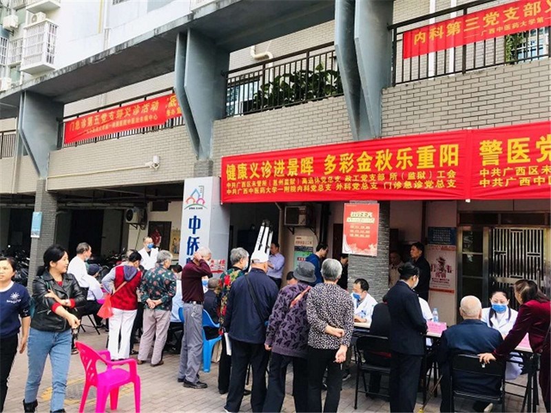 浓情惠金秋,献礼重阳节。10月21日,一附院内分泌科王振刚、脑病一区蔡伦、推拿科苏赐明、治未病中心廉永红、杨体,脾胃病二区杨成宁、眼科彭崇信、老年病科邢俊娥等11位医护专家受邀赴自治区未成年犯管教所景晖社区开展健康义诊,现场共服务300余人次,受到职工热烈欢迎。