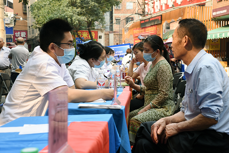 活动现场,泌尿外科、骨科、内分泌科、妇科、心血管内科、消化内科、儿科、眼科等党员医护人员,为前来就诊的社区居民进行疾病诊疗、保健咨询和健康宣讲。在义诊过程中,医护人员一边为就诊居民讲解常见疾病预防的相关知识,还开展“因人制宜”体质辨识,为居民制定个体化的健康治疗方案,耐心地叮嘱他们各种日常注意事项,并让大家体验到雷火灸等中医特色疗法,其中还为45岁以上的男性居民现场免费抽血筛查前列腺癌。“现在社区的服务真贴心,医生讲得还清楚,使我们这些腿脚不方便的老年人,在家门口就能享受到这么专业的服务,中国共产党真是全心全意为人民服务的党!”在做雷火灸的张阿姨看到医生们胸前闪耀的党徽忍不住称赞道。医护人员认真负责的态度、高超专业的技术、耐心细致的服务赢得了群众们的一致称赞。