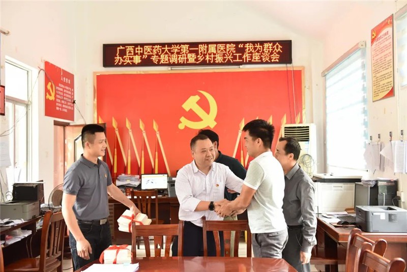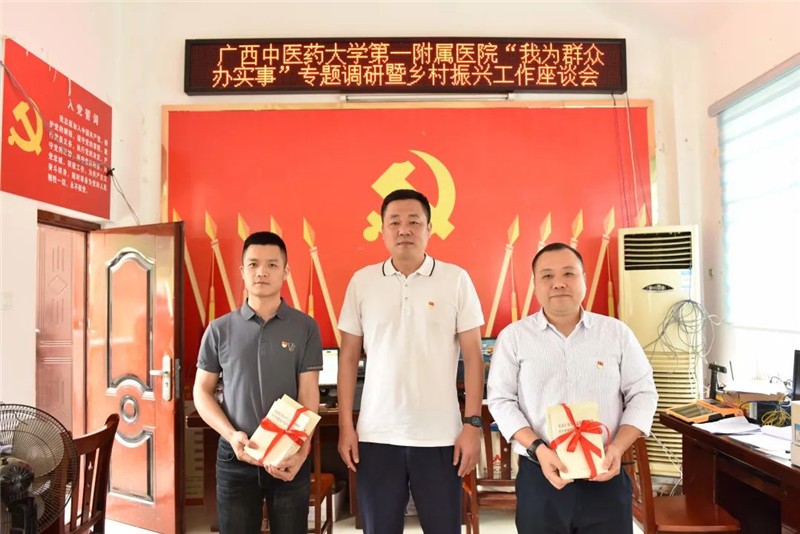 在座谈会上,桂雄斌代表一附院党委向新老“第一书记”赠予党史学习教育丛书,激励原“第一书记”返回一附院岗位后,继续发光发热,新“第一书记”接过接力棒继续在乡村振兴的道路上带领乡亲们不断努力前行。