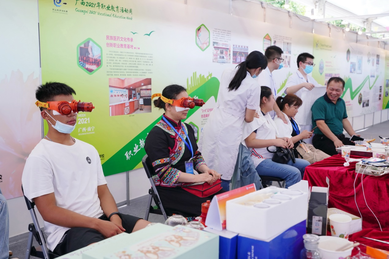 在为期1天的活动中,中医学校的教师以饱满的精神和热情的态度积极参展。在“职业教育服务建设壮美广西”主题展示区,展示了中医特色疗法体验项目(中医推拿、百罐灸、刮痧等),以及学校自主研制的中医药特色产品(利咽茶、利咽膏、口红、润唇膏、中药祛痘面膜、中药驱蚊香薰、中药驱蚊喷雾),以及Beat365中医药文化养生药膳馆展示的药膳(石斛鸡汤),前往展区体验的领导、嘉宾、师生络绎不绝,并得到一致好评。