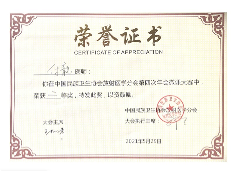 一附院放射科付靓老师荣获中国民族卫生协会放射医学分会第四届年会中文微课比赛二等奖