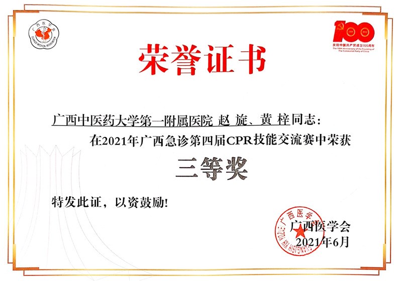 6月18日,由广西医学会主办、广西医学会急诊医学分会承办的广西急诊第四届 CPR 技能交流赛在南宁市成功举办。此次大赛目的是促进全区各医院间急救技术的交流,展现广西急诊年轻医护人员的风姿风采,提高专业急救技能。交流赛共有来自广西51家医院的137名急救医护精英参赛,一附院仙葫院区急诊科选派住院医师赵旋和护士黄梓两名队员参赛并荣获三等奖的好成绩。
