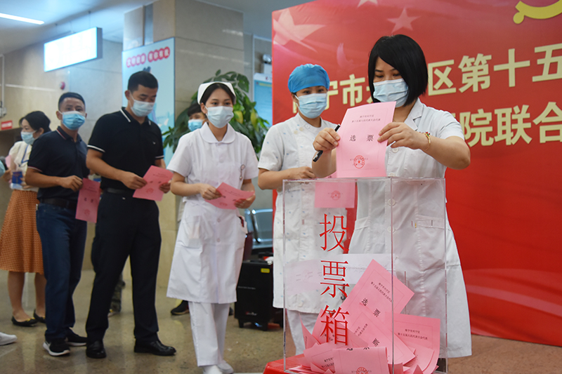 投票当天,设在医院A座1楼的投票站现场秩序井然。主持人首先对医院联合选区选举兴宁区第十五届人大代表名额及有关事项作了详细的说明,接着宣读本选区正式代表候选人名单、《选举办法》,最后经监票人现场检查票箱,加封上锁后,投票正式开始。选民们将选民证交给工作人员核验后,领取一张选票并认真填写,最后在监票人的监督下向票箱郑重投下选票。为了方便医院临床一线医务人员及特殊岗位的选民投票,投票站还设置了2个流动投票箱。