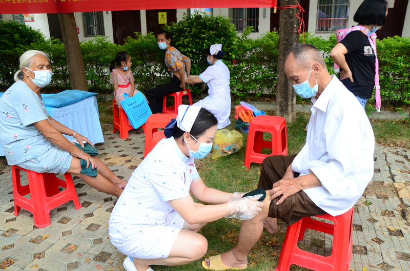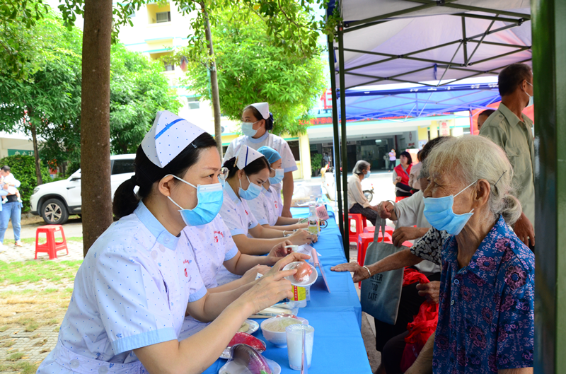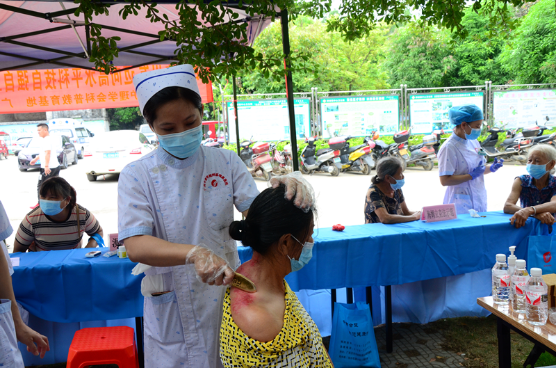 义诊现场,医护人员为现场群众把脉问诊、测血压、测血糖,向群众免费发放健康宣传资料,热情解答他们提出的各种问题,耐心地指导他们相关的疾病保健及护理知识,不少现场群众还体验了多样化中医特色治疗,如:火龙罐、雷火灸、艾灸箱、刮痧、中药烫熨、耳穴压豆等;当天,专家们还现场组织了海姆立克法等应急常识及新冠疫情下自我防控知识等专题培训。专家们精湛的技术和热情的服务,得到了群众的一致好评。参加义诊群众200余人,发放宣教资料500余份。