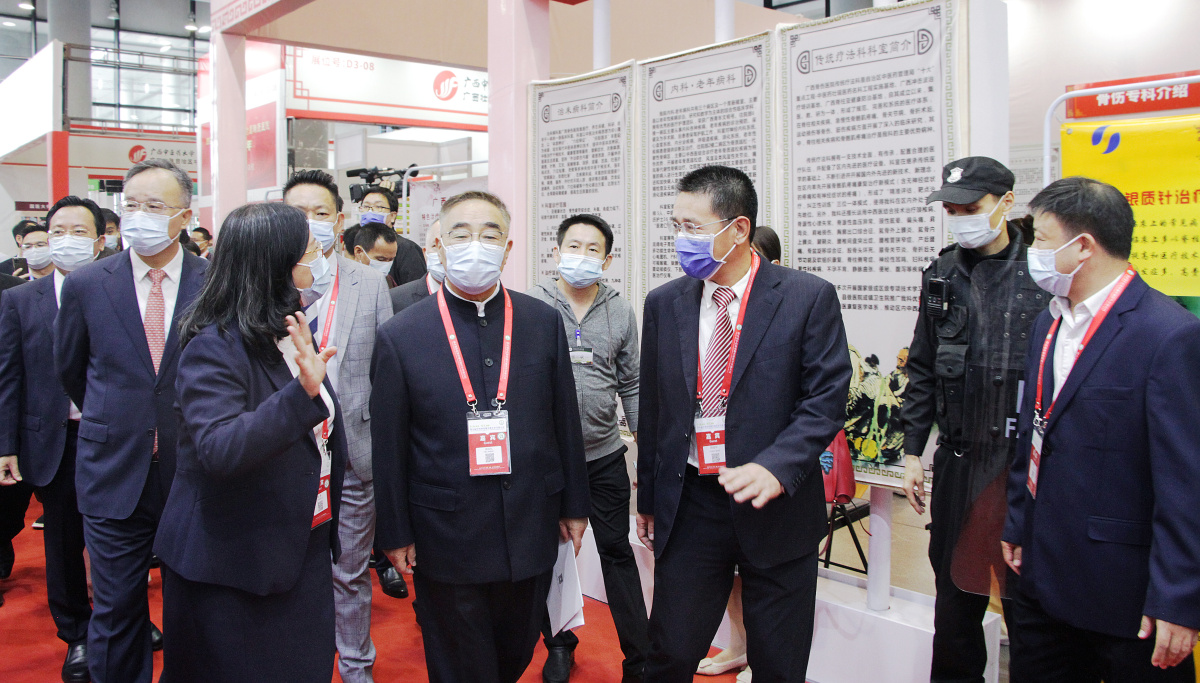 自治区副主席黄俊华(左二),“人民英雄”国家荣誉称号获得者、中国工程院院士张伯礼(左四)到广西国际壮医医院展厅参观