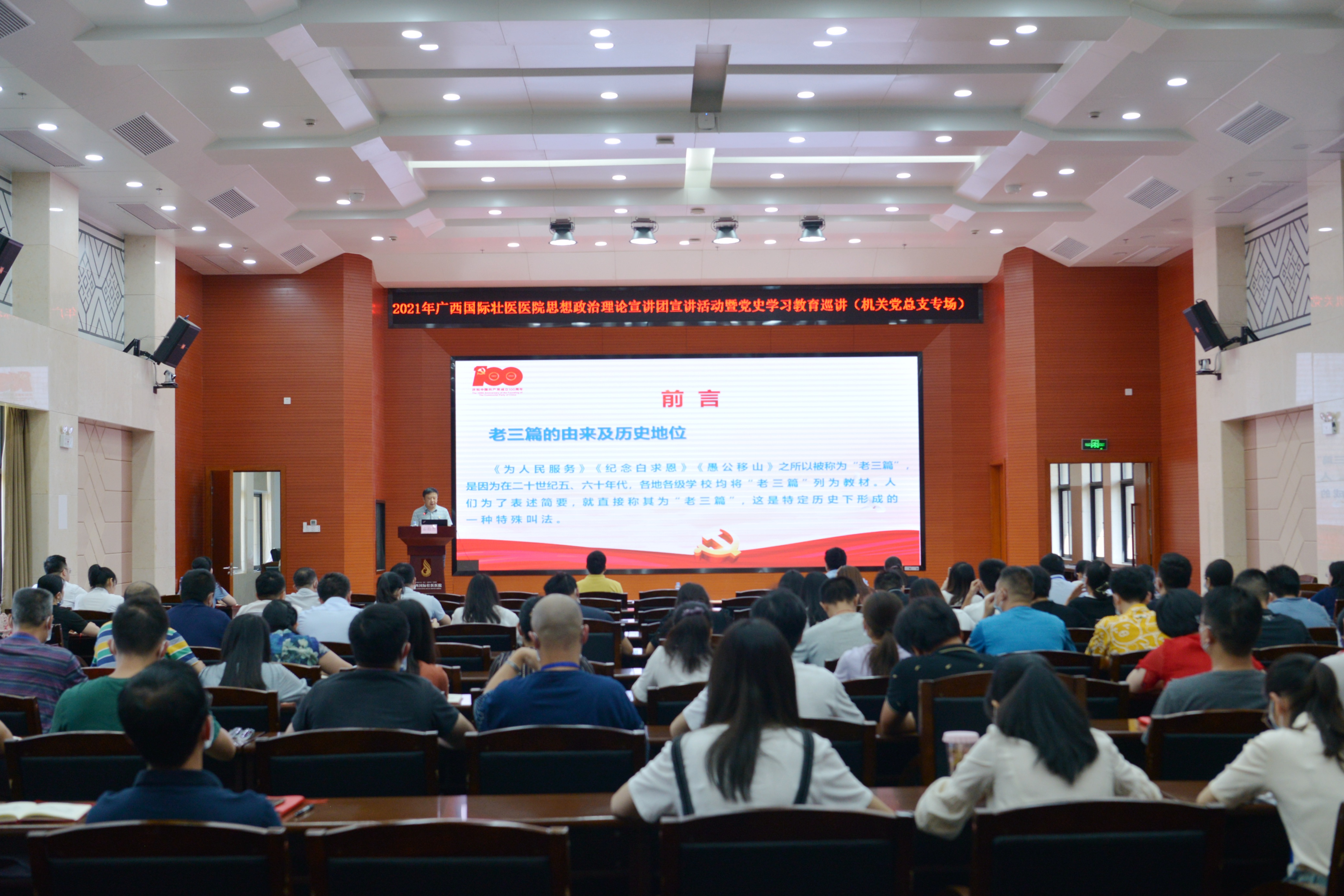 为不断创新党史学习教育方式,附属国际壮医医院遴选出39名具有深厚理论功底的党员干部组建思想政治理论宣讲团,创新形式讲述红色故事、传播党的理论。院党委书记秦祖杰、党委副书记吴光、纪委书记罗艺徽,副院长黄国东、李铭、唐盛军、李继清积极发挥“头雁领航”作用,率先推动以讲促学。