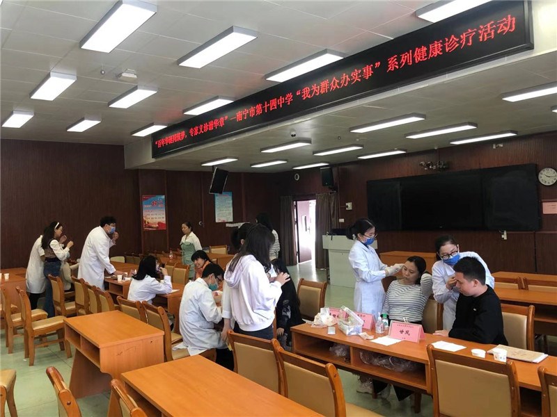应南宁市十四中五象校区邀请,一附院由外联拓展部组织东葛治未病中心与仙葫院区脾胃肝病科、康复科等八人,赴十四中五象校区开展健康义诊活动。
