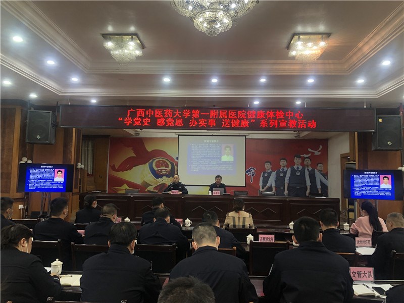 11月18日,一附院健康体检中心主任田丽玲一行4人受邀来到马山县公安局,以“学党史 感党恩 办实事 送健康”为主题,为马山县的基层民警、辅警开展健康知识讲座。