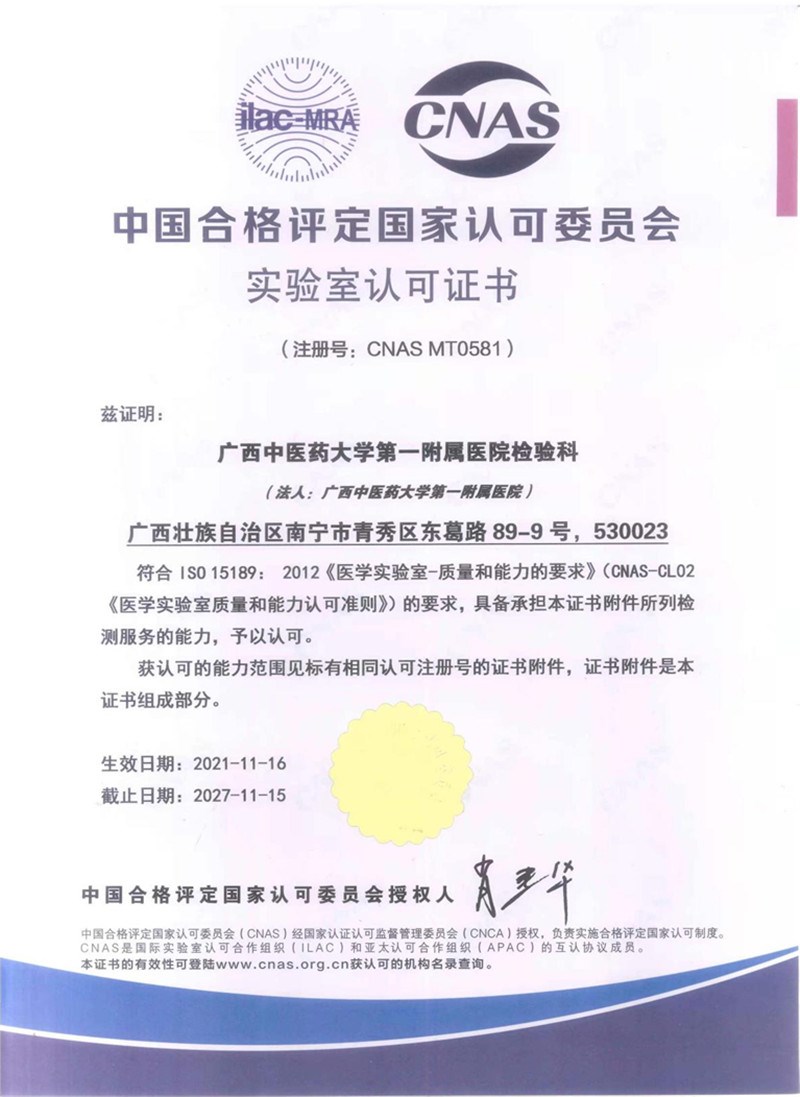 近日,一附院检验科收到了来自中国合格评定国家认可委员会(CNAS)颁发的ISO15189医学实验室认可证书,正式成为中国ISO15189质量与能力认可的医学实验室。这标志着一附院检验科的质量管理已达到国际标准化水平,具备出具国际医疗机构认可报告的能力,其检验结果可在全球多个国家的数千家实验室得到互认。