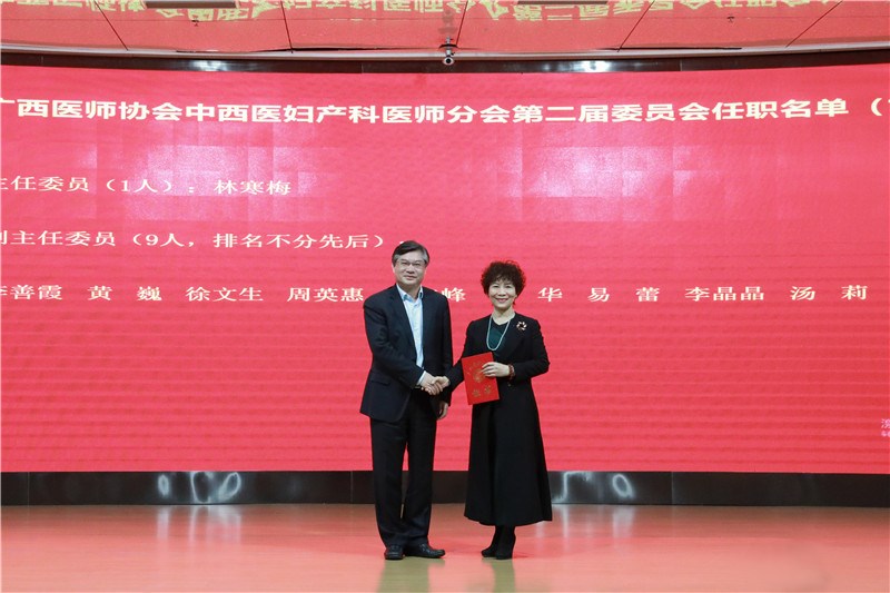 一附院院长谢胜为广西医师协会中西医妇产科医师分会主任委员林寒梅颁发证书