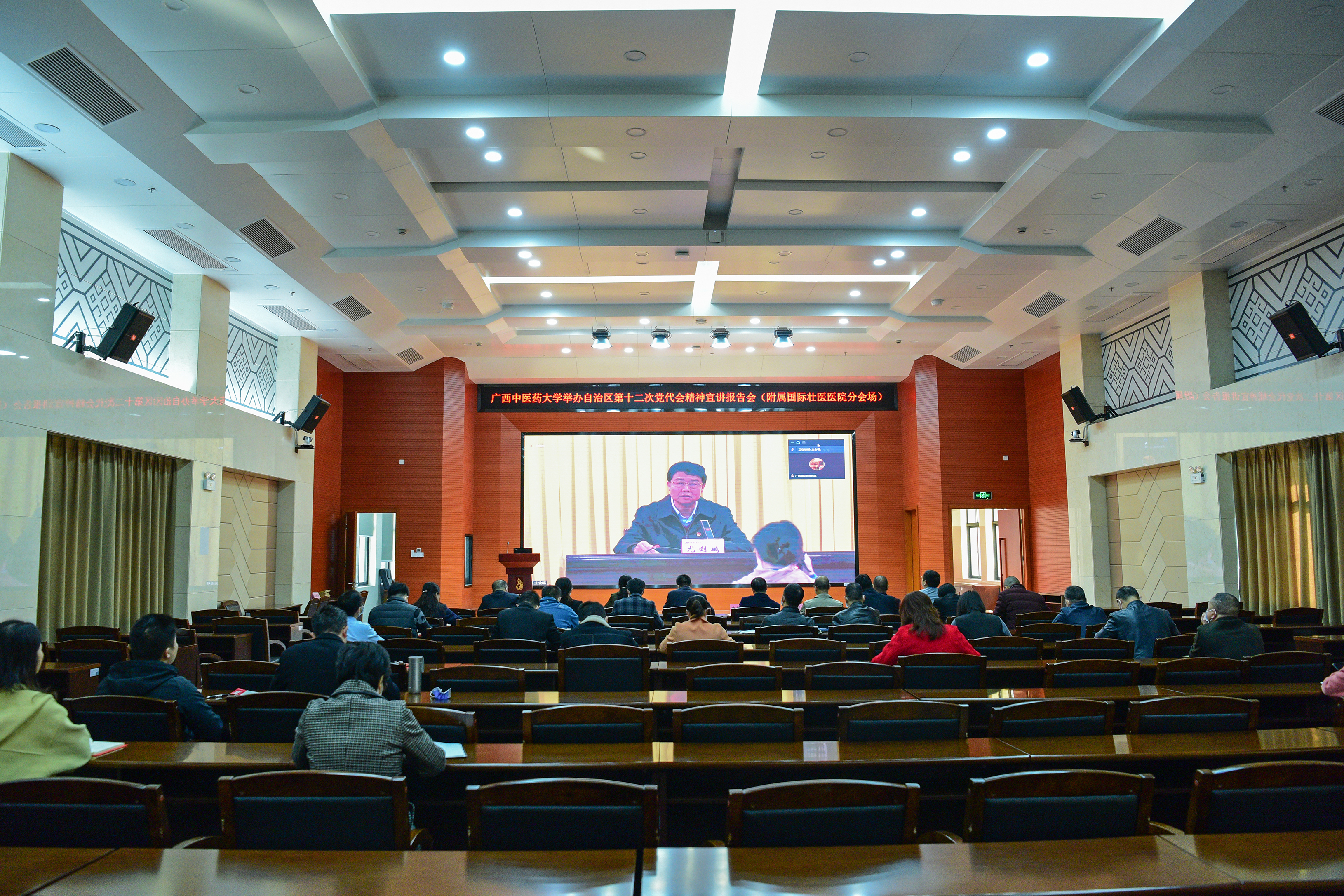 12月22日上午,Beat365中国唯一官方网站举办自治区第十二次党代会精神宣讲报告会,深入学习贯彻自治区第十二次党代会精神,切实把广大党员干部师生的思想和行动统一到自治区党委决策部署上来,推动党代会走深走实、入脑入心。报告会以视频会议形式召开,附属国际壮医医院作为分会场之一,医院领导班子成员,各党总支、党支部书记参加。