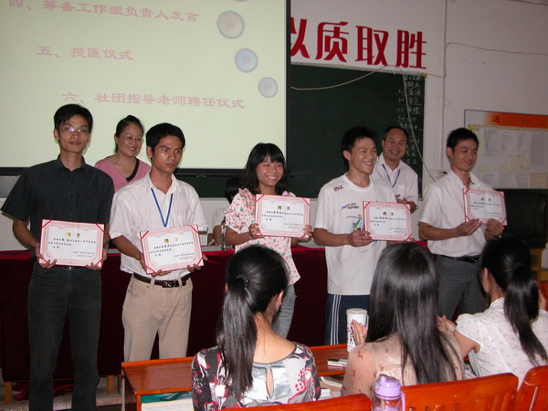 紧接着学校党委罗艺徽副书记为“杏芽文学社”、 “篮球协会”授匾。学校党委罗艺徽副书记、学生科黄勇科长、学生科江育萍副科长为各社团指导老师颁发聘书。