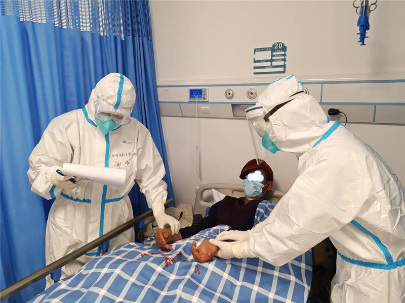 广西新型冠状病毒肺炎中医药救治专家组组长、一附院院长谢胜为患者把脉