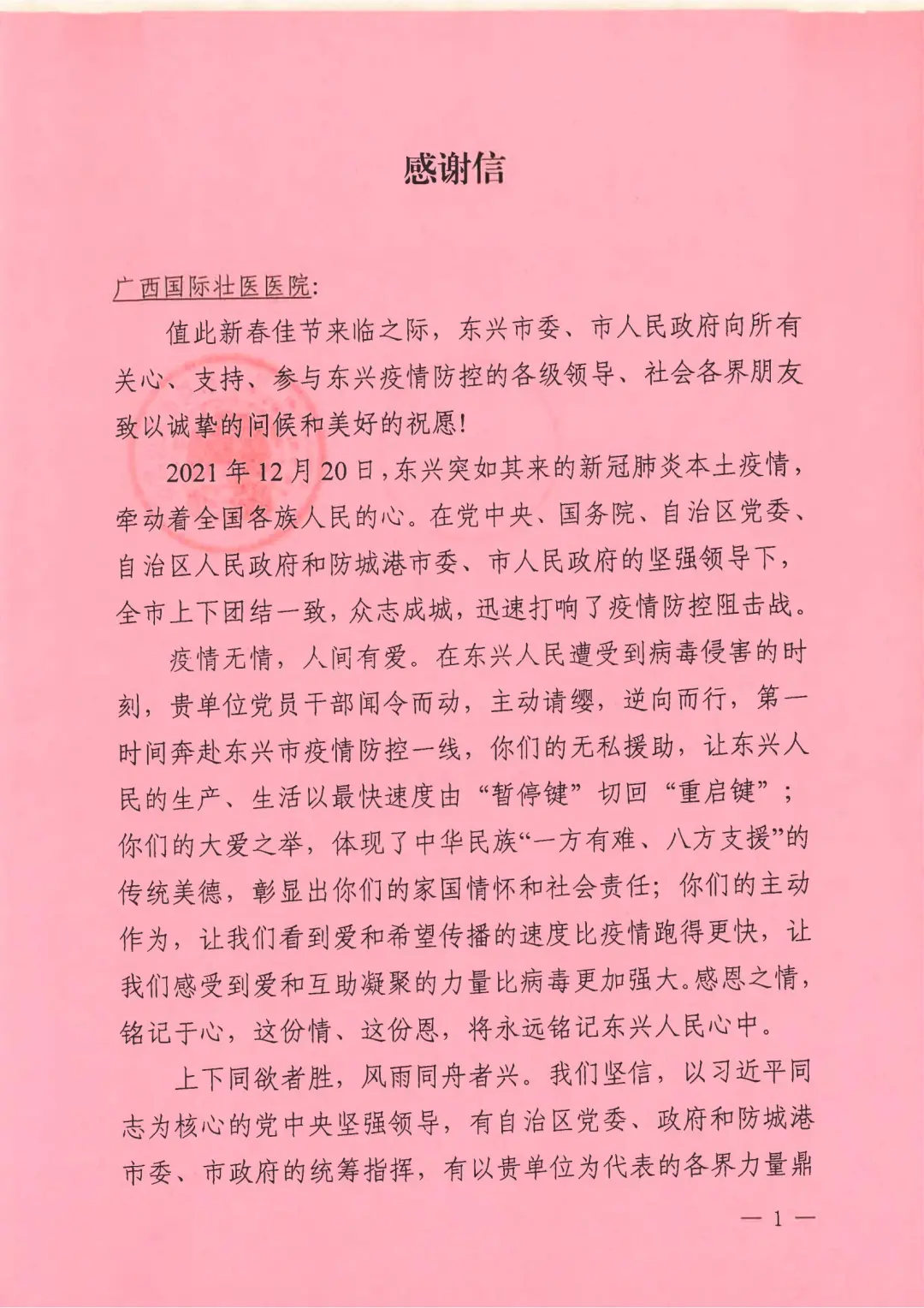 并肩战“疫”丨 东兴市来鸿致谢 来源:附属国际壮医医院 作者:宣传科 日期:2022-02-15 点击数: 次 分享到: 12月23日,广西国际壮医医院副院长李继清带领103人医疗队伍,紧急支援防城港市的疫情防控工作。4天时间,医疗队根据广西防城港市疫情指挥部全员核酸检测队安排,先后前往市内30余个地点设立核酸检测采样点,累计采样2.7万余人次,顺利完成核酸检测采样任务。目前,除支援东兴医疗队13人奋战在抗疫一线外,其余支援人员已全员安全返回。近日,中共东兴市委员会、东兴市人民政府特来鸿致谢。 打印正文 关闭本页