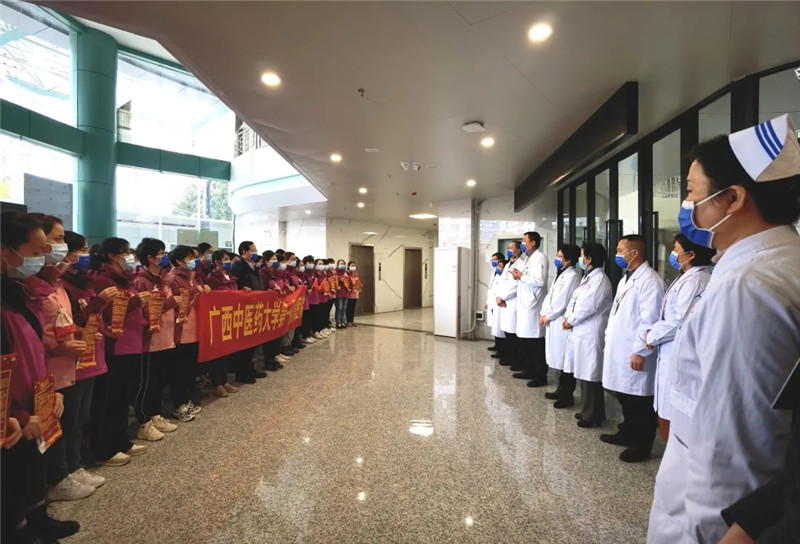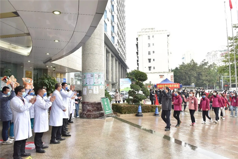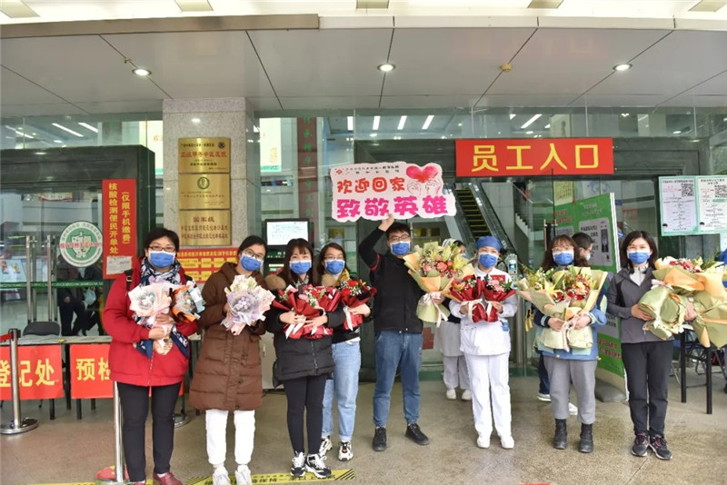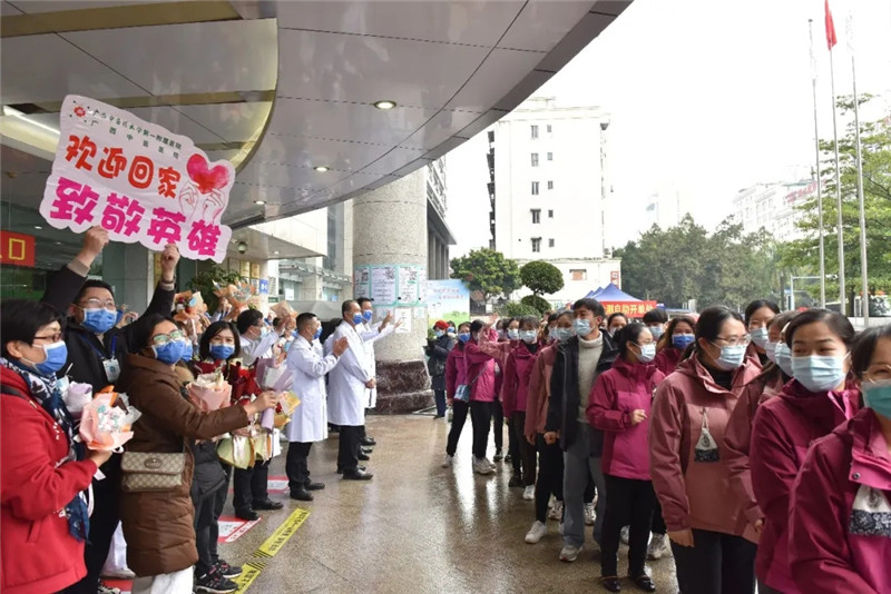 一附院党委书记桂雄斌在迎接时对队员们说:“十天前,你们舍小家为大家,闻令而动,迎难而上,迅速集结赶赴百色;十天后,百色疫情防控取得阶段性进展,你们圆满完成疫情防控任务,证明了广中医是一支来之能战、战之能胜的队伍,你们是一附院的骄傲,欢迎你们回家!”