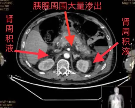 CT检查发现,廖爷爷胰腺周围大量渗出,双侧肾周积液,被确诊为重症急性胰腺炎