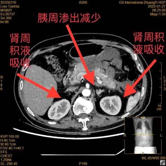 最新的CT检查显示,廖爷爷的胰腺渗出减少,双侧肾周积液已被身体吸收,病情稳定