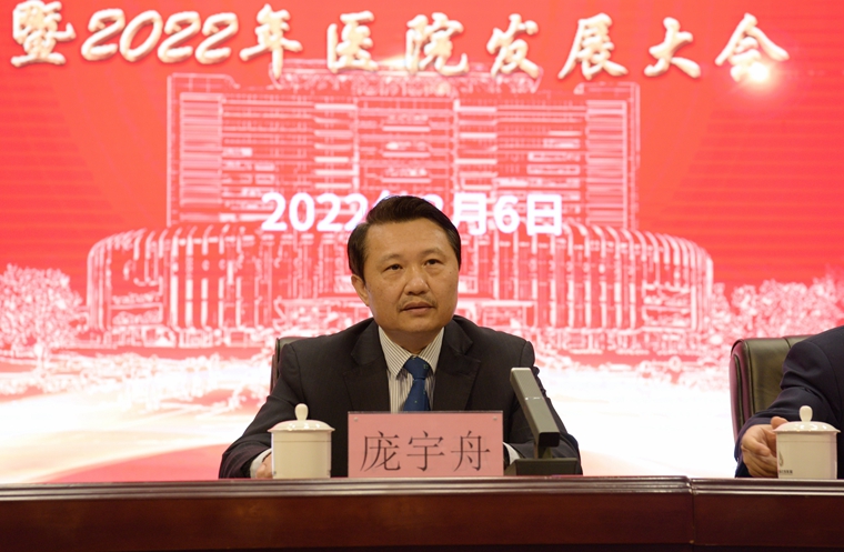 庞宇舟在会上作指导性讲话。他表示,学校领导班子充分肯定医院取得的成绩,对医院发展寄予厚望。他指出,医院要以强化党建引领、提升医疗服务水平、加快人才队伍建设、提升科研教学能力、提高医院管理水平、增强资金保障能力、做好防疫抗疫等七个方面为抓手,强化学习意识、大局意识、责任意识、实干意识、创新意识、质量意识、效率意识,奋力开创医院高质量发展新篇章。
